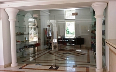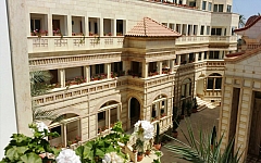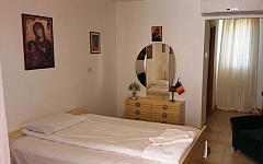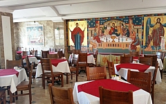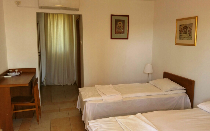 De la acest pasaj aflat sub turnul clopotnitei, incepe corpul casei pentru pelerini care se desfasoara pe trei nivele urmate de o terasa. De pe aceasta terasa se poate vedea cu usurinta tot Ierihonul cu livezile sale bogate de arbori cu fructe exotice recunoscute pentru aroma lor in tot Israelul. De asemenea se pot vedea sirul muntilor dimprejur si de dincolo de Iordan pana la Marea Moarta. Privelistea minunata vazuta de aici ne prezinta dupa cuvantul Scripturii "toate imparatiile lumii si slava lor". Dincolo de sfintenia acestor locuri prin care a umblat Fiul lui Dumnezeu si sfintii Sai cei alesi, frumusetea aceasta aproape paradisiaca a Ierihonului atrage anual foarte multi turisti, parte dintre ei doritori sa ramana macar pentru o vreme aici. Tocmai de aceea, camerele asezamantului nostru au fost gandite ca spatii speciale care sa ofere turistilor si pelerinilor, cele mai bune conditii de rugaciune si liniste, de confort sau studiu, sau odihna. Fiecare camera dispune de baie si dus, precum si de terase care permit vizitarea intregului asezamant. in partea finala a constructiei se afla corpul numit egumenie, adica locul in care se vor organiza chiliile calugarilor ce vor avea in grija serviciul liturgic si treburile administrative ale manastirii.