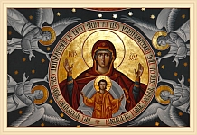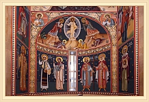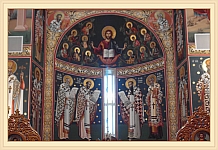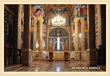 Privind din interior, din inaltul bisericii, strajuieste chipul lui Dumnezeu Pantocrator cel Care tine in mana Sa viata tuturor oamenilor. Mainile Sale intinse aduna in biserica ca intr-un cosmos liturgic pe toti sfintii chemati sa se roage impreuna cu noi. Prezenta lor aici ne insufla de fiecare data o pace si o bucurie desprinsa parca din vesnicia cerului coborat pe pamant. Pe aici a pasit Dumnezeu si a facut minuni care au adunat in jurul Sau mii de oameni din toate neamurile pamantului. Dintre acestia ne-am straduit sa reprezentam aici sfintii cei mai dragi ai neamului nostru, incepand de la marii dascali si invatatori din trecutul bisericii si pana la martirii si sfintii din zilele noastre. intreaga pictura este lucrata in fresca si pe langa chipurile mentionate de sfinti apar si numeroase scene biblice din Ierihon, si de pe valea Iordanului, precum si numerosi sfinti de neam roman. in momentul de fata altarul bisericii este complet pictat si lucrarile continua spre naos, in partea din mijloc, in asteptarea altor fonduri sau unor donatori care doresc sa participe la finalizarea lucrarilor de picura.